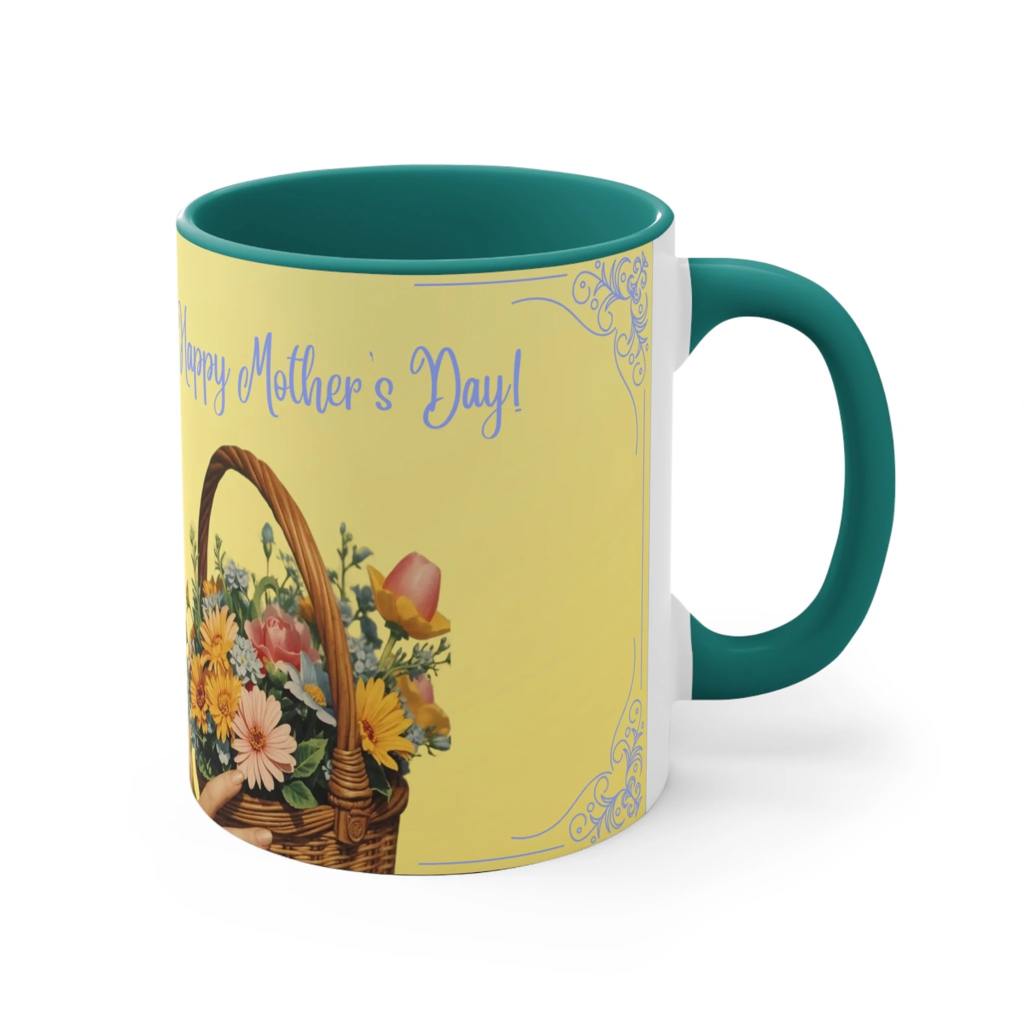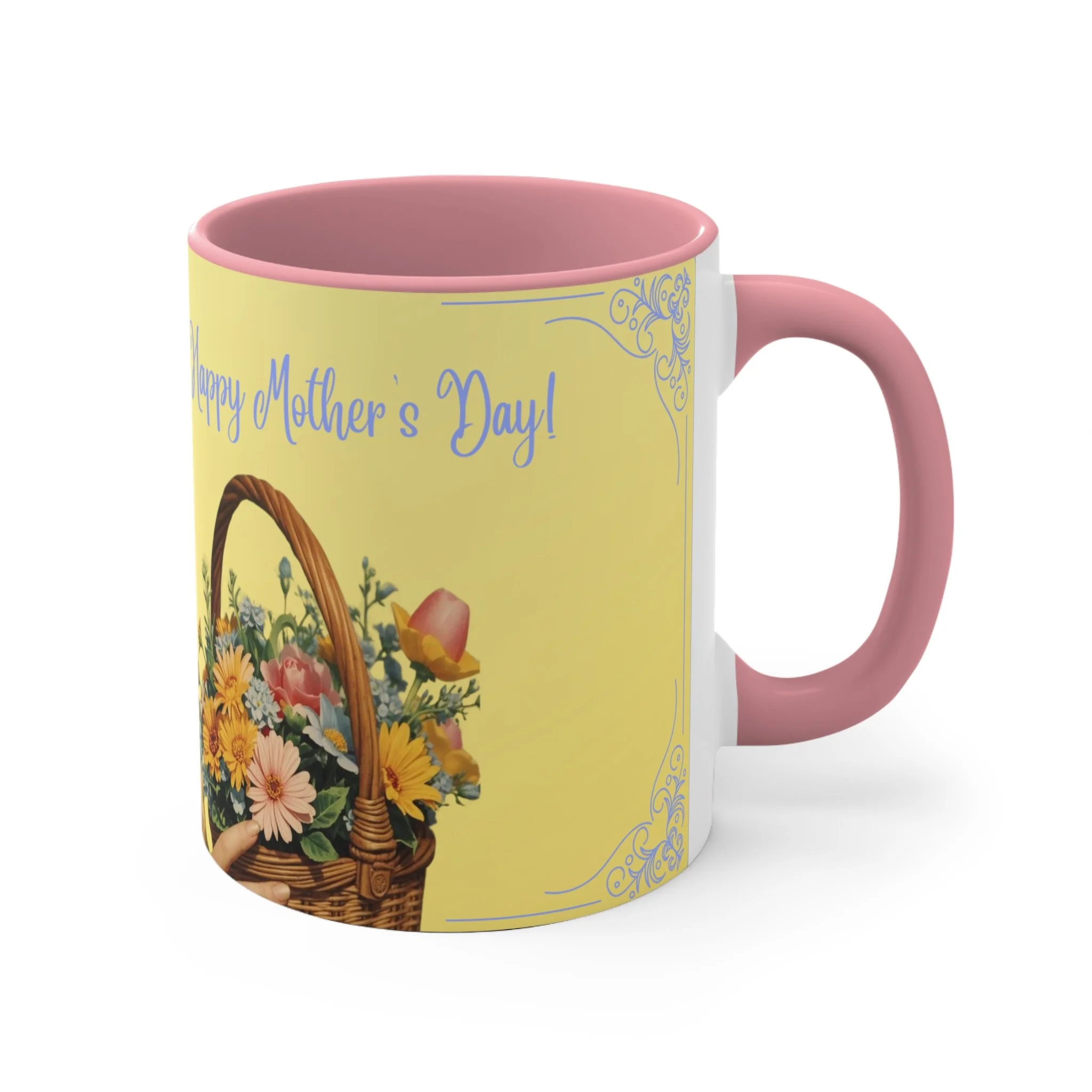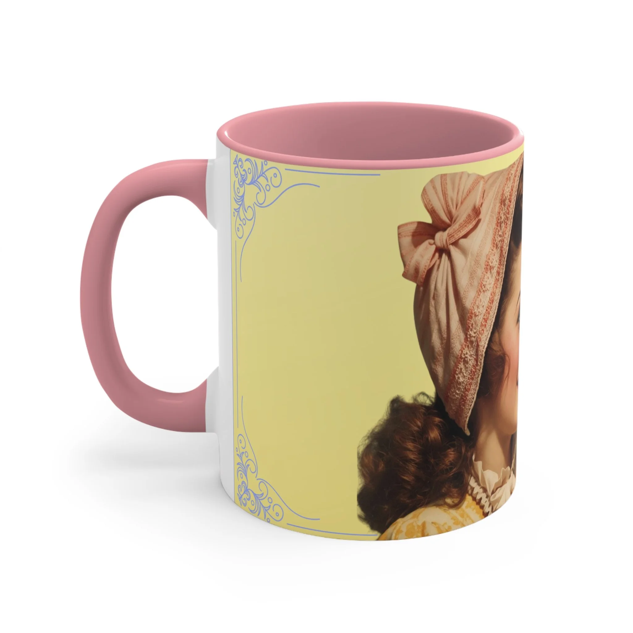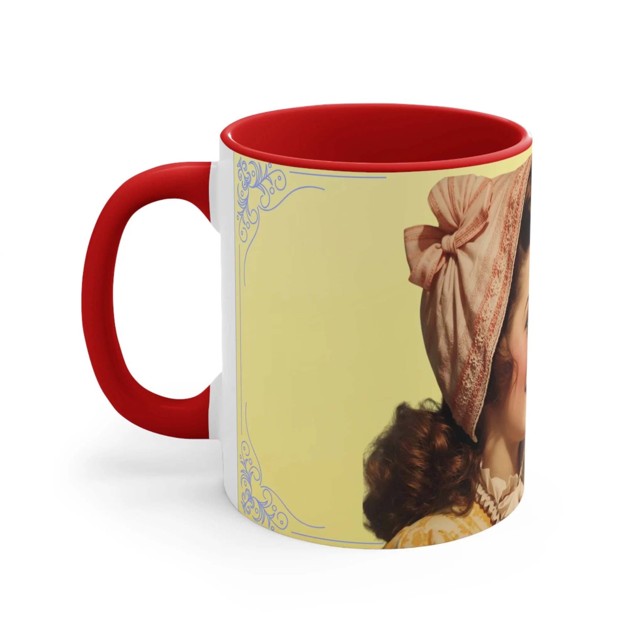 The personalized accent mug is exactly what mug merchants have been waiting for. With an array of color schemes (blue/white, green/white, red/white, and pink/white), these handled mugs give designers a wonderful canvas to work from. Any artwork is embellished relative to color schemes. The quality ceramic and printing can withstand machine washing.