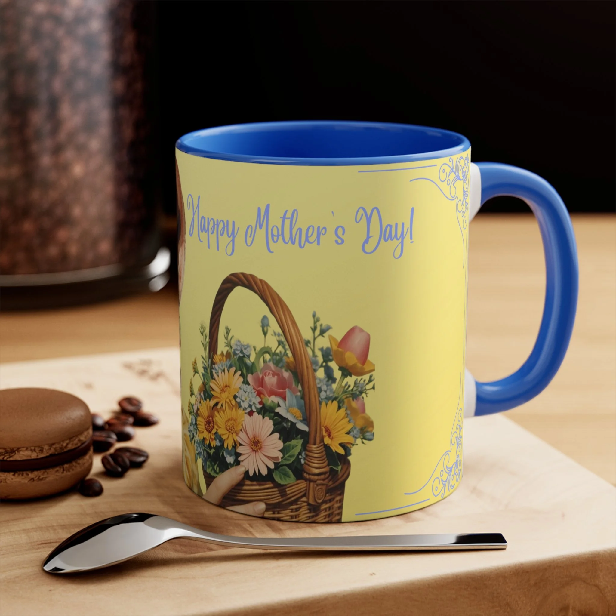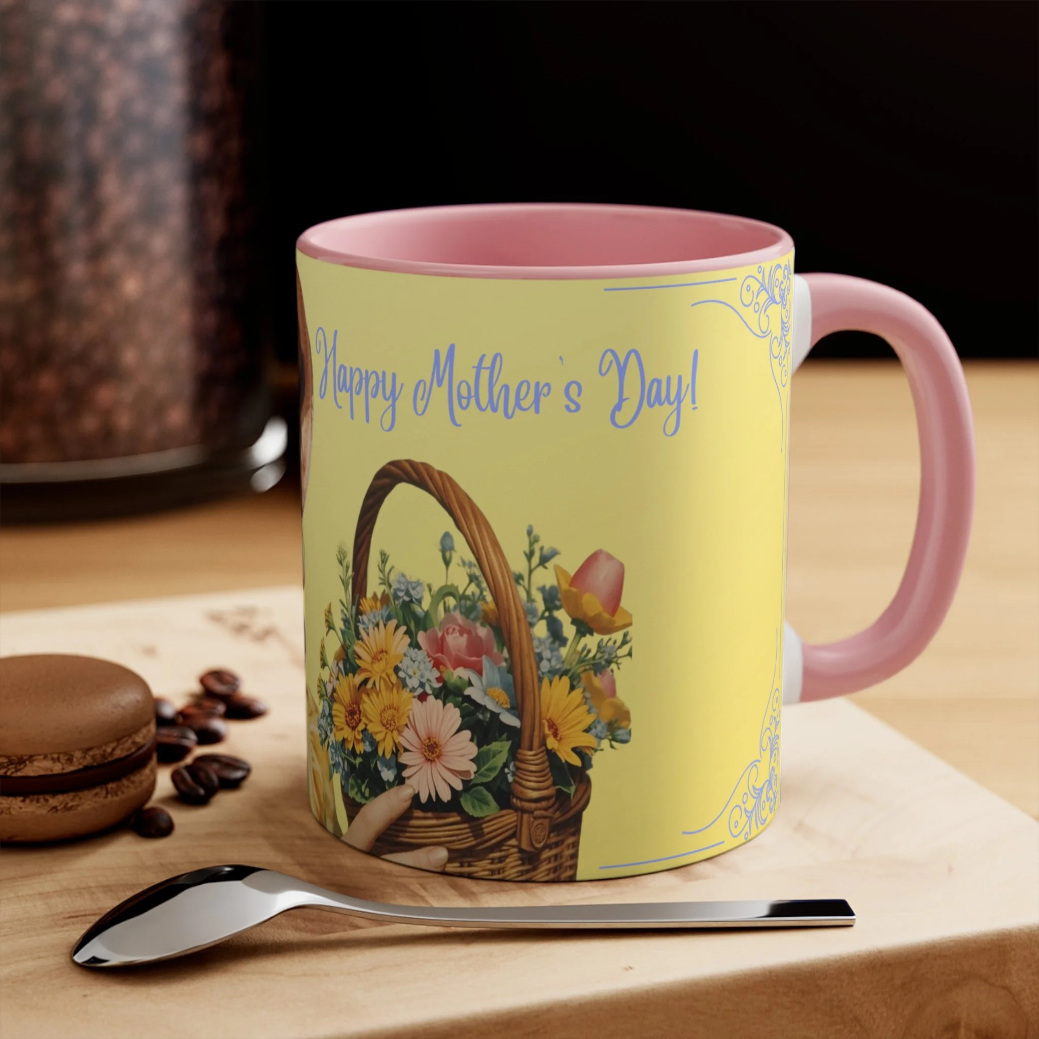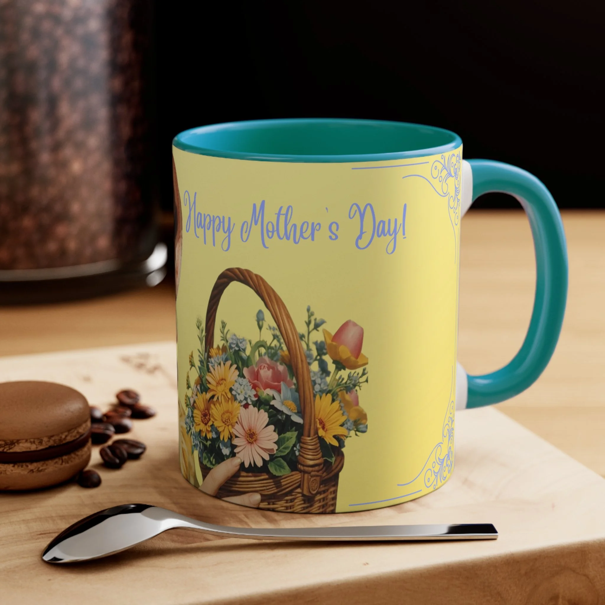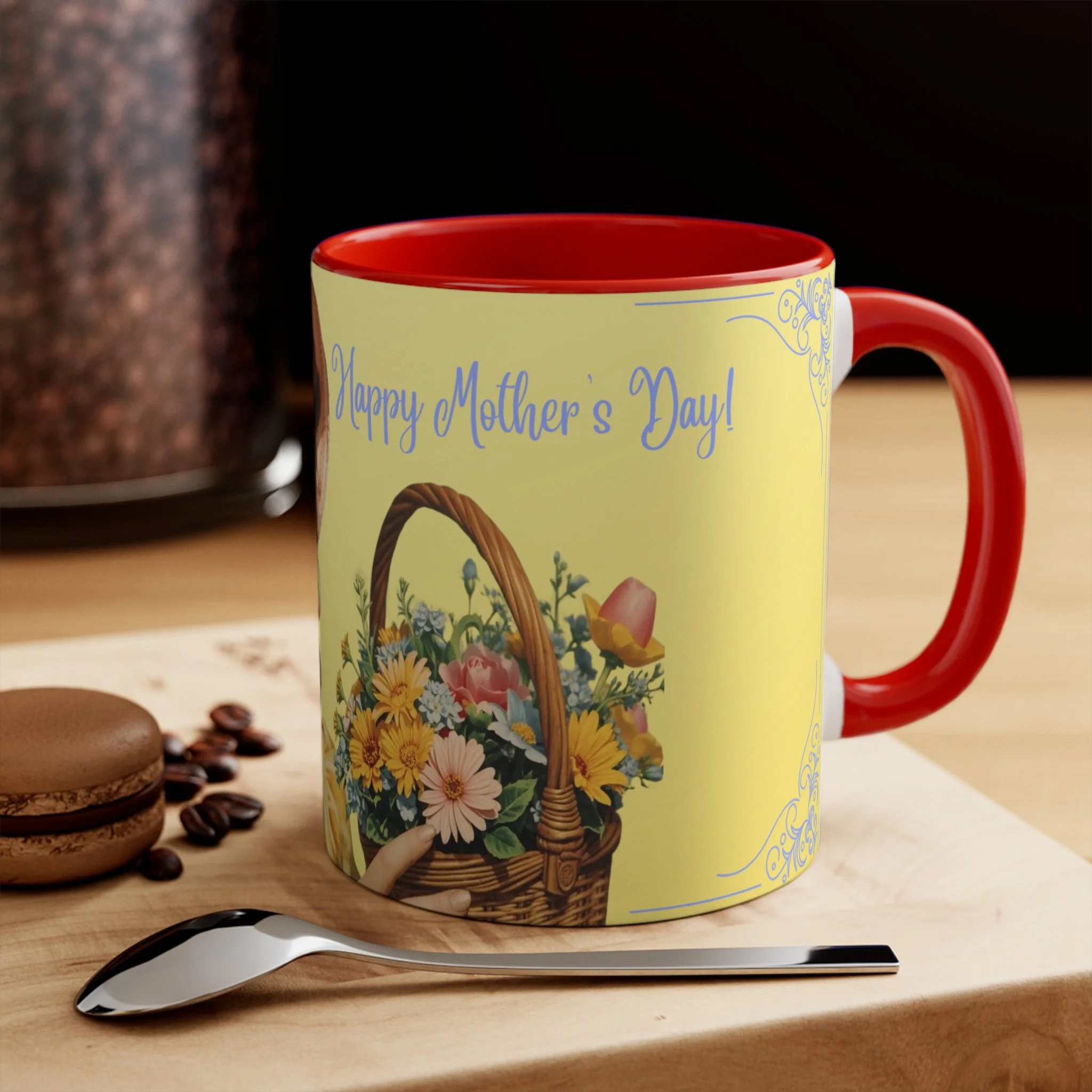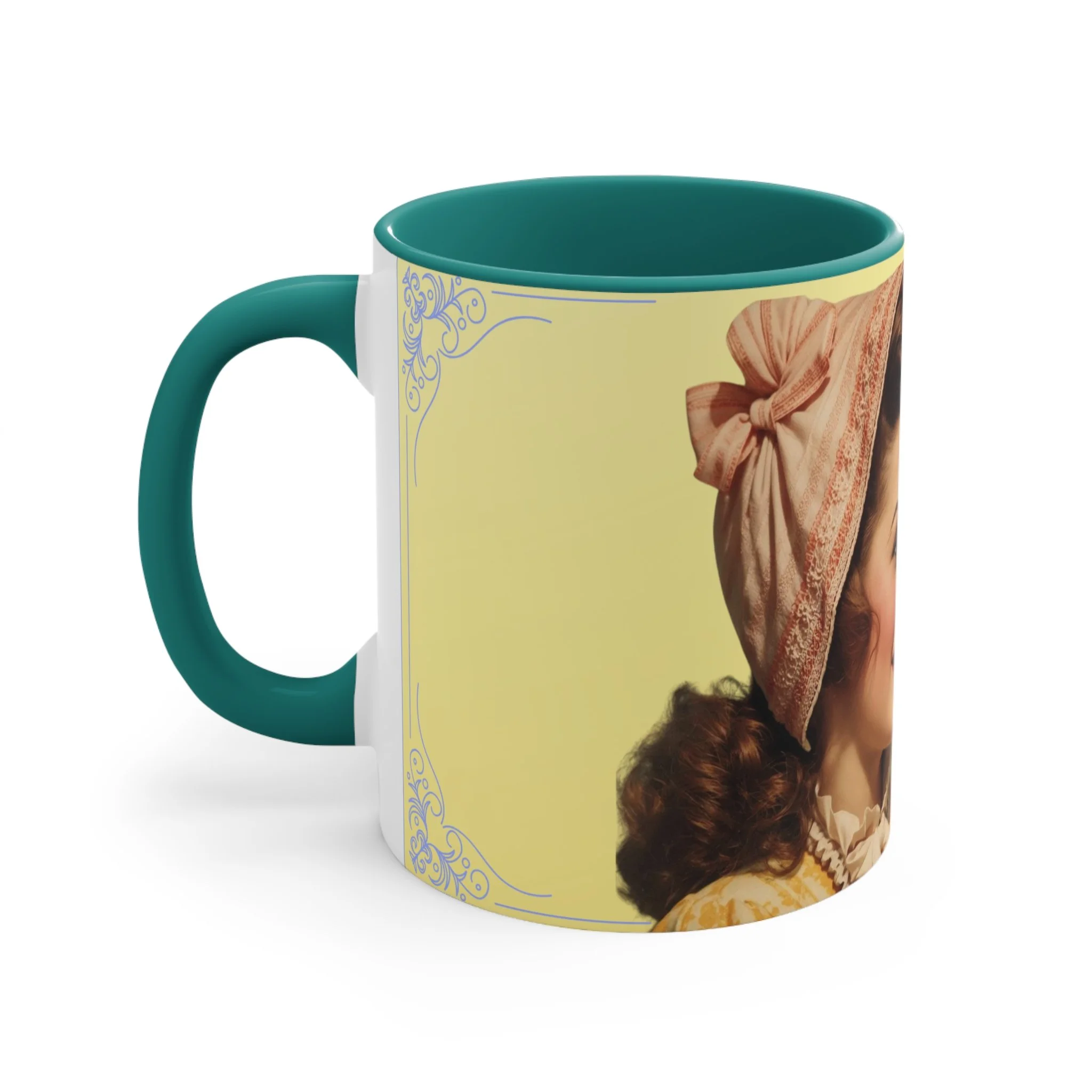 The personalized accent mug is exactly what mug merchants have been waiting for. With an array of color schemes (blue/white, green/white, red/white, and pink/white), these handled mugs give designers a wonderful canvas to work from. Any artwork is embellished relative to color schemes. The quality ceramic and printing can withstand machine washing.