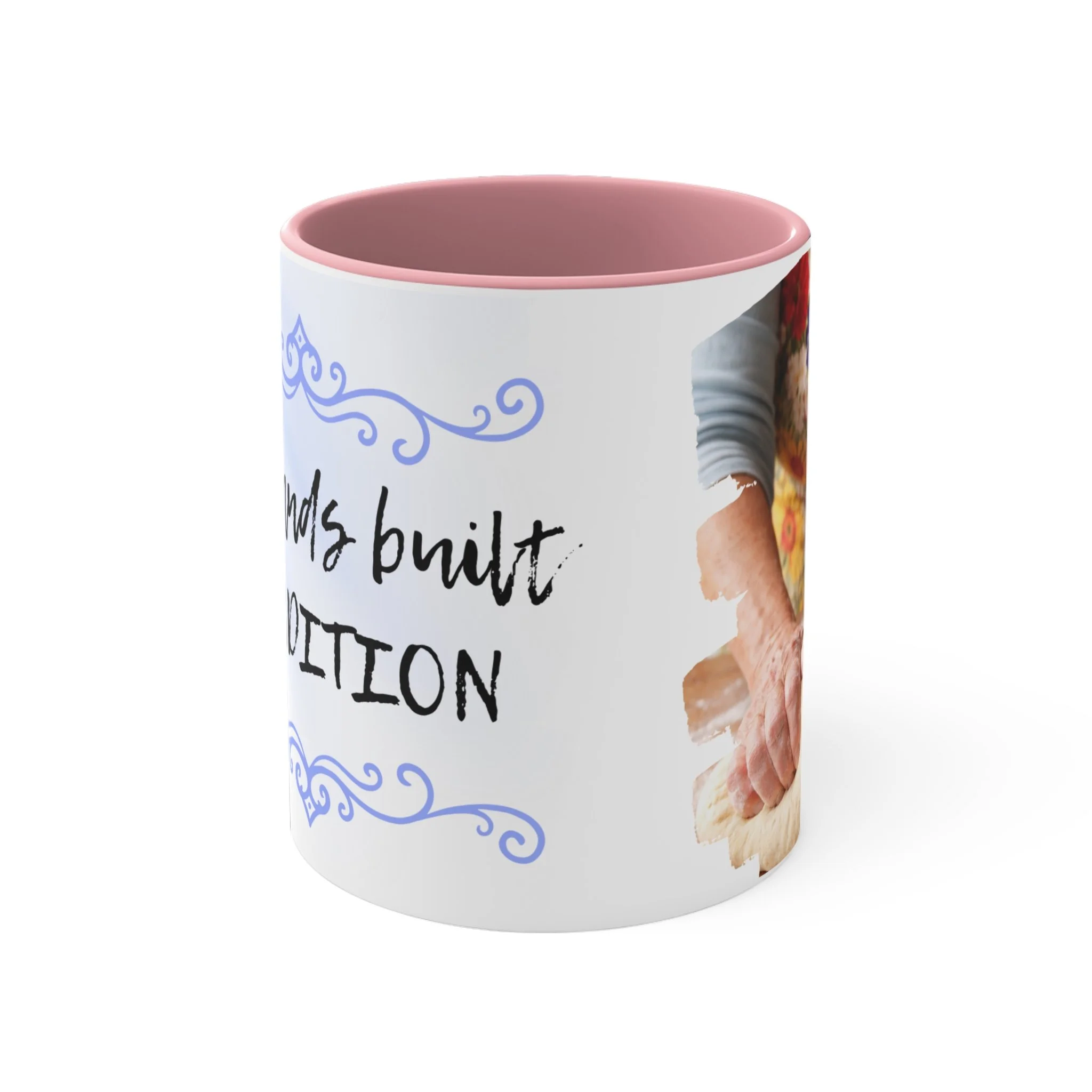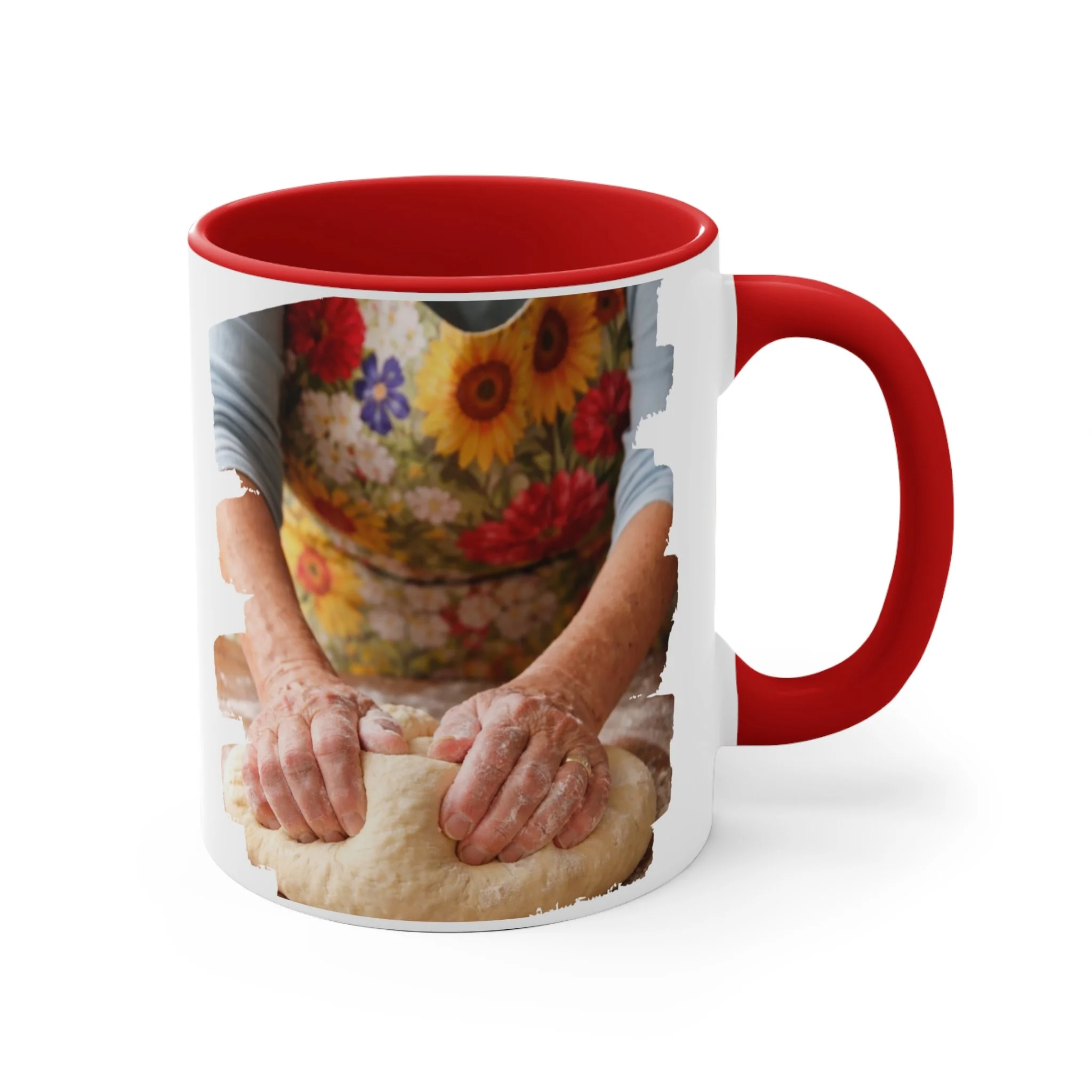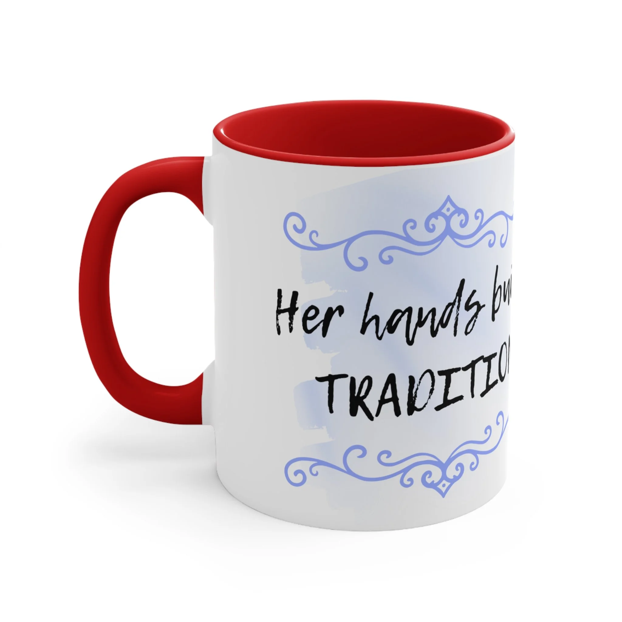With an array of color schemes (blue/white, green/white, red/white, and pink/white), these handled mugs give designers a wonderful canvas to work from. The quality ceramic and printing can withstand machine washing. .: Material: white ceramic with colored interior and handle .: One size: 11 oz (0.33 l) .: Rounded corners .: C-handle