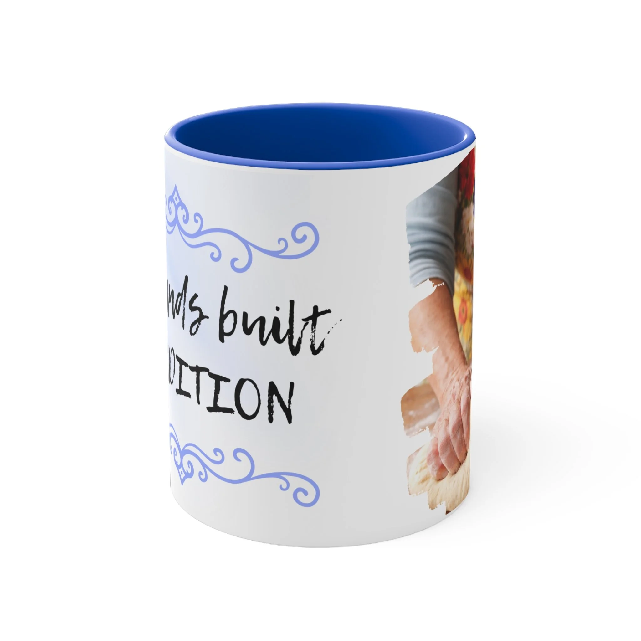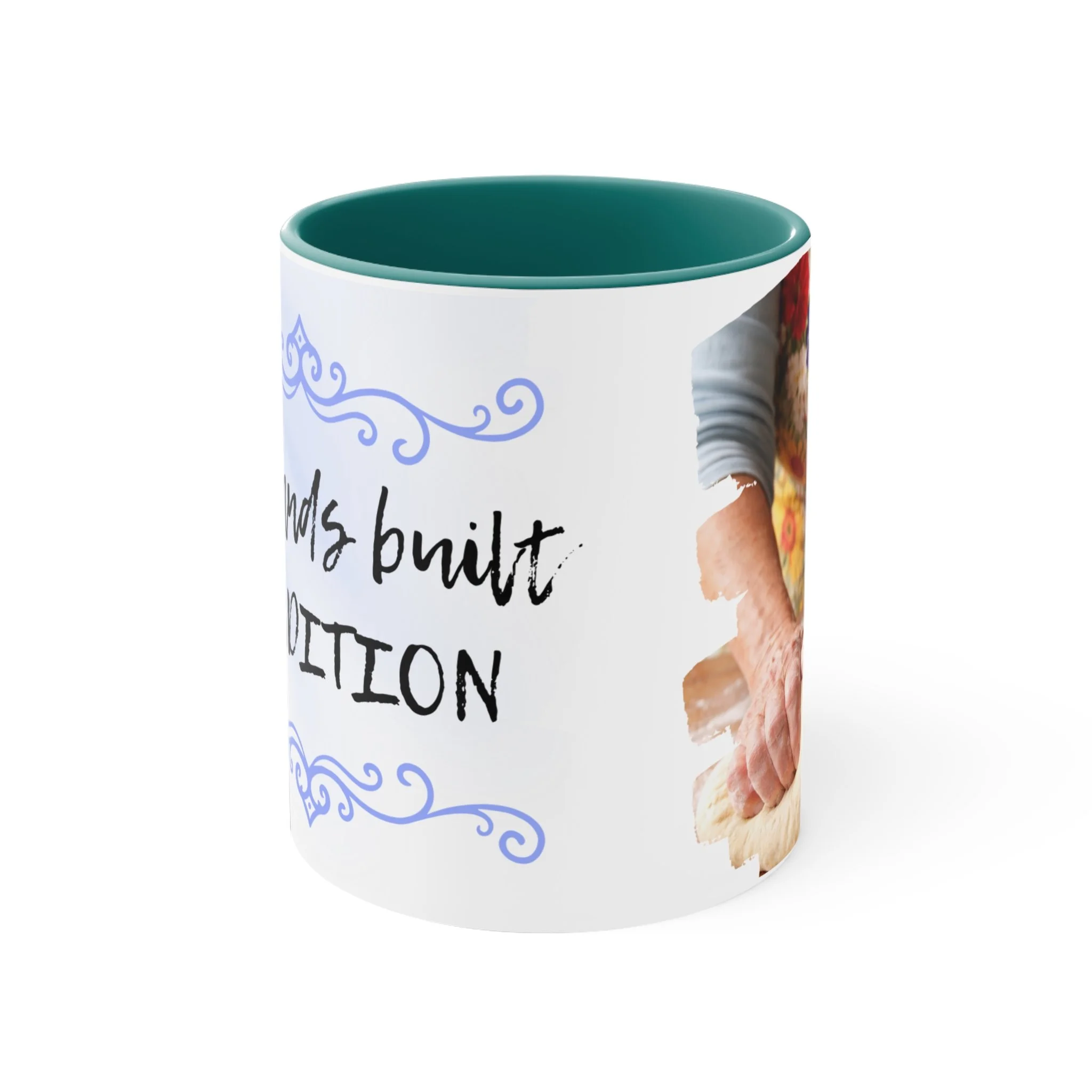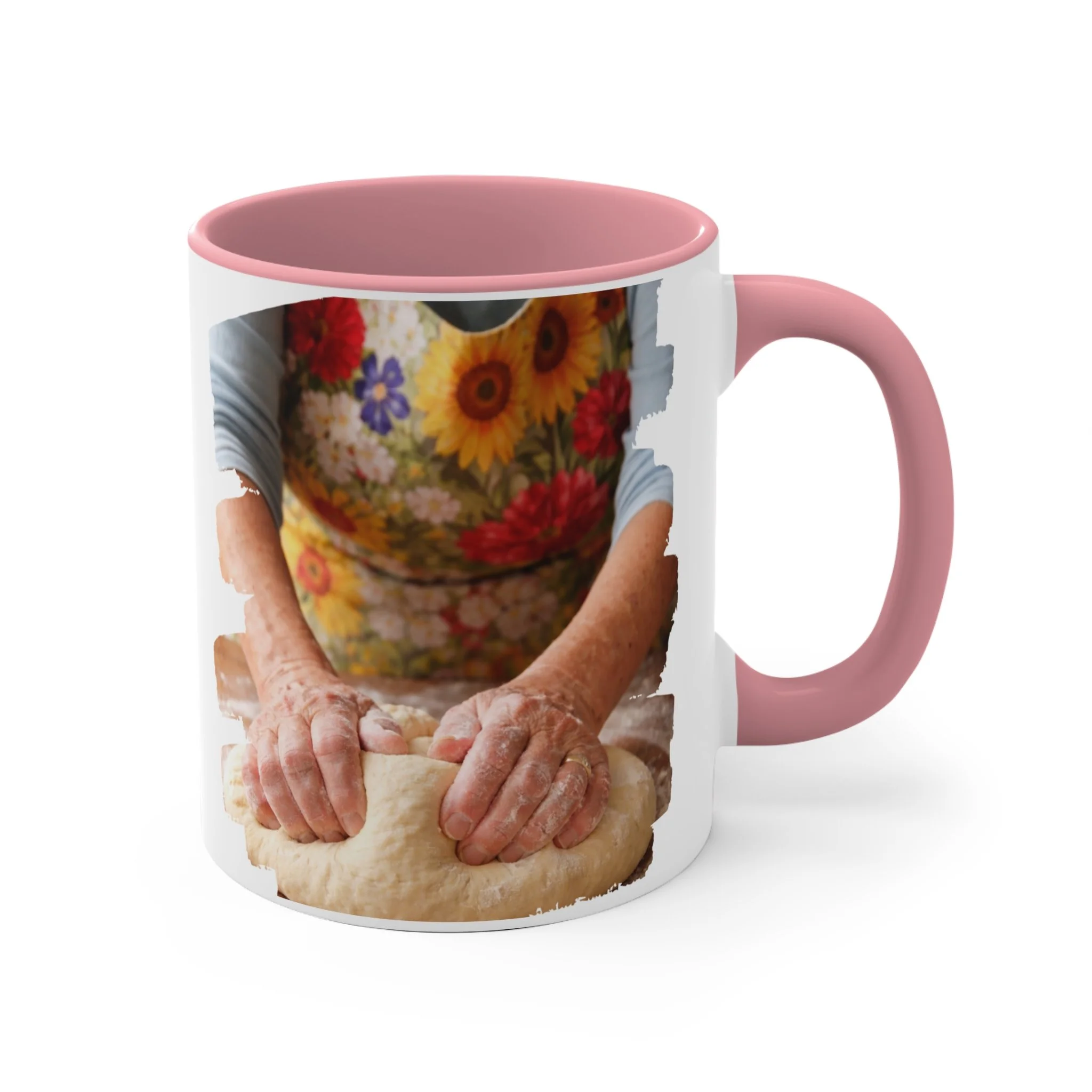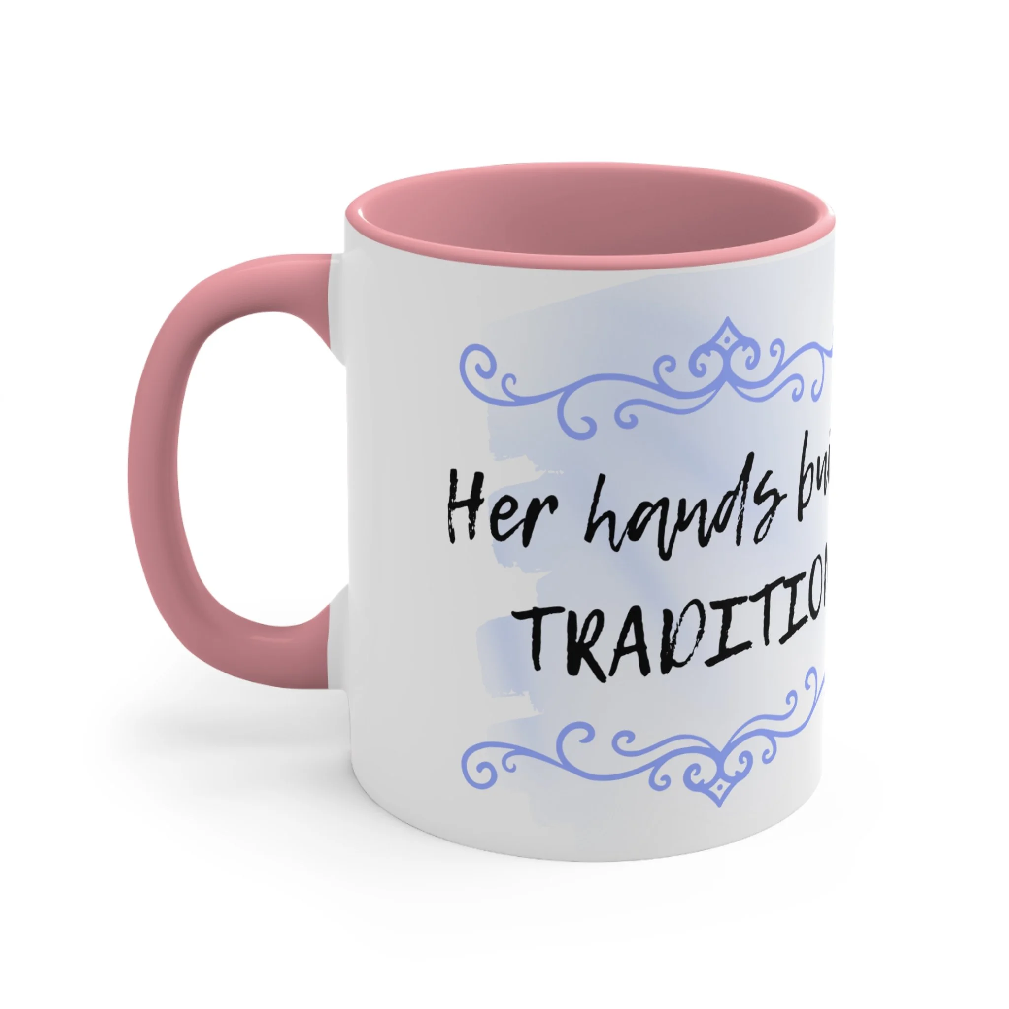 With an array of color schemes (blue/white, green/white, red/white, and pink/white), these handled mugs give designers a wonderful canvas to work from. The quality ceramic and printing can withstand machine washing. .: Material: white ceramic with colored interior and handle .: One size: 11 oz (0.33 l) .: Rounded corners .: C-handle